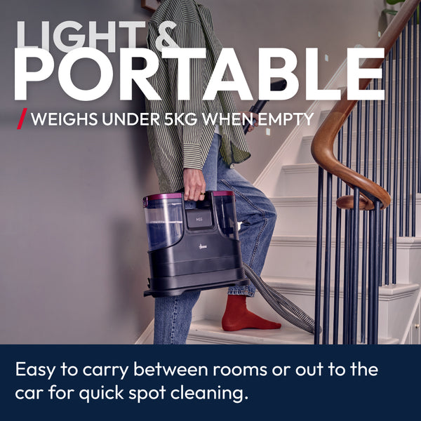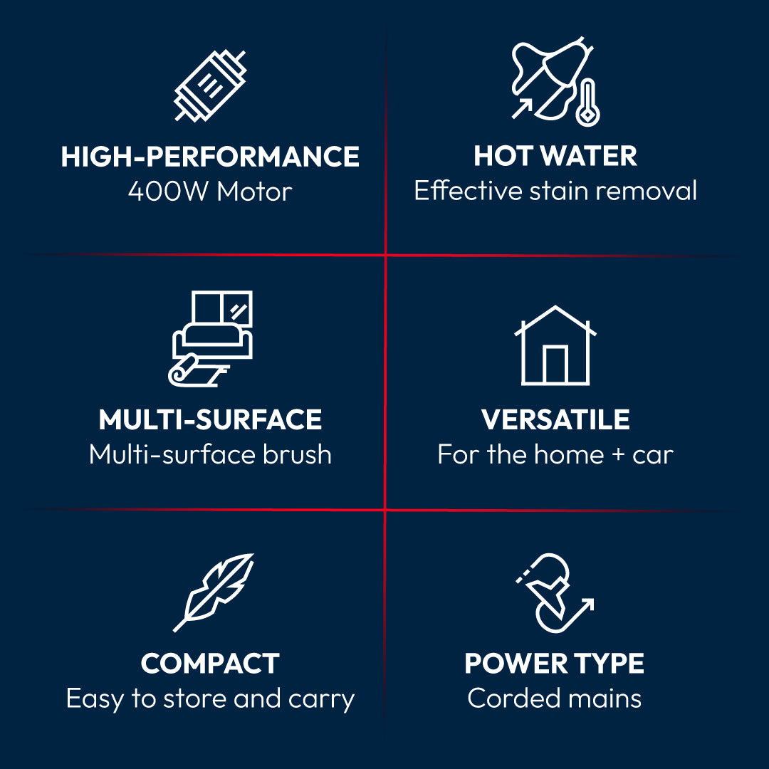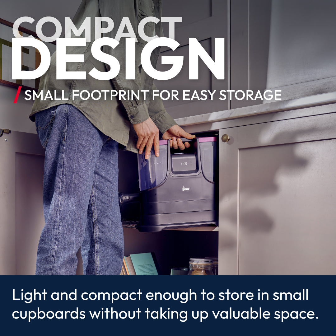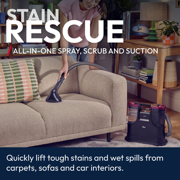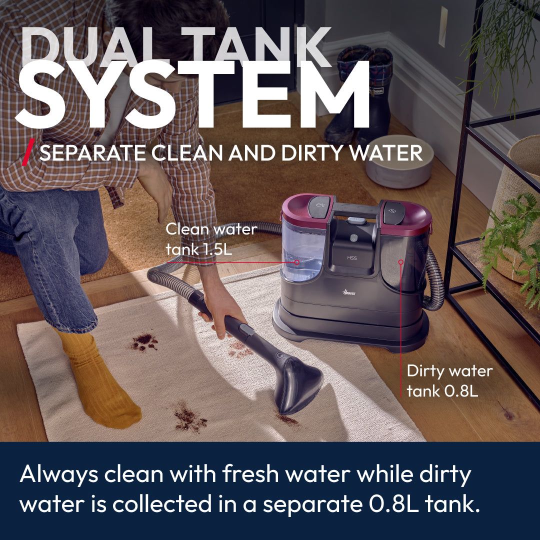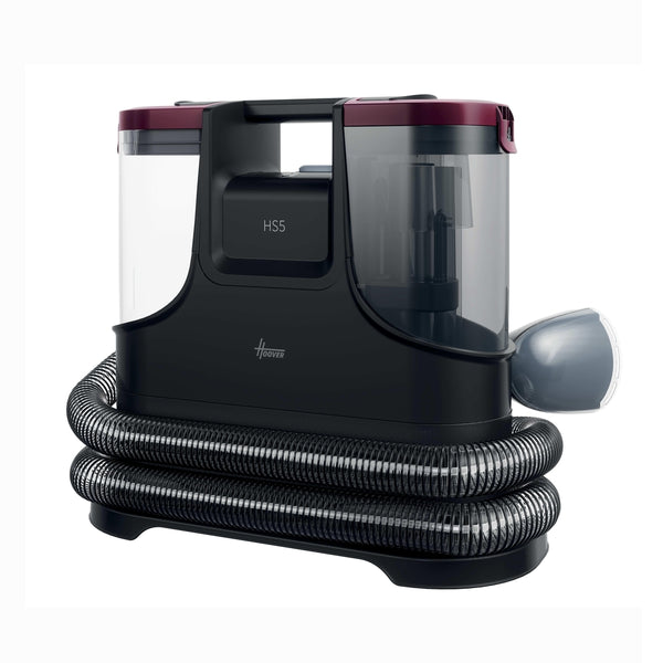 The Hoover HS5 Spot Wash & Dry removes stains fast with heated water (40°C in 30 seconds) and powerful 400W suction. It sprays, washes, brushes, and vacuums all at once—ideal for carpets, upholstery, cars, and glass. Compact and easy to store, it includes multiple tools for versatile cleaning.