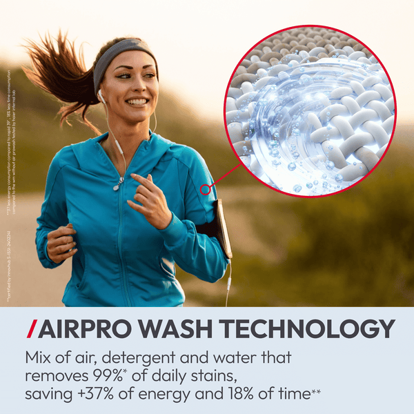 - Faster stain removal: AirPro Wash saves energy and cares for fabrics better.