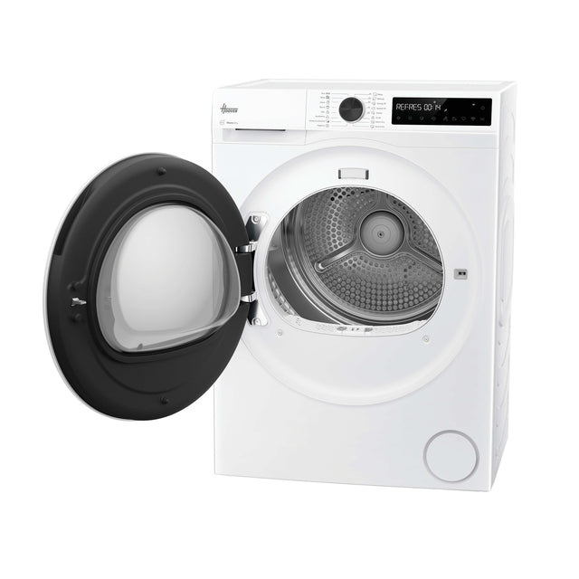 The Hoover Pro Dry Series 3 (Heat Pump) Tumble Dryer - White - 9KG offers energy-smart drying with a 99.9% antibacterial Hygiene Cycle and gentle care for delicates. Featuring AI Smart Move for tangle-free results, it is easily managed via the hOn app.
