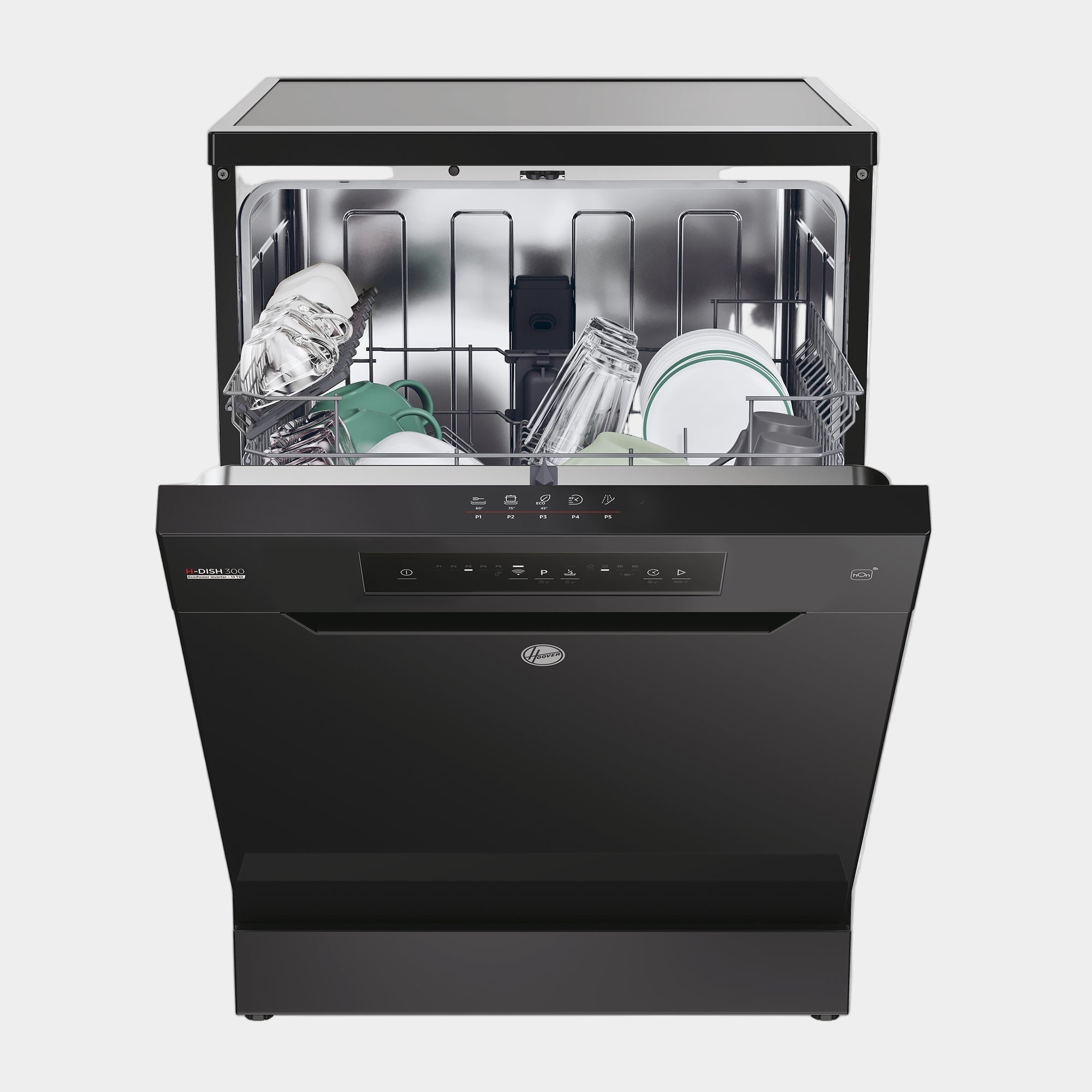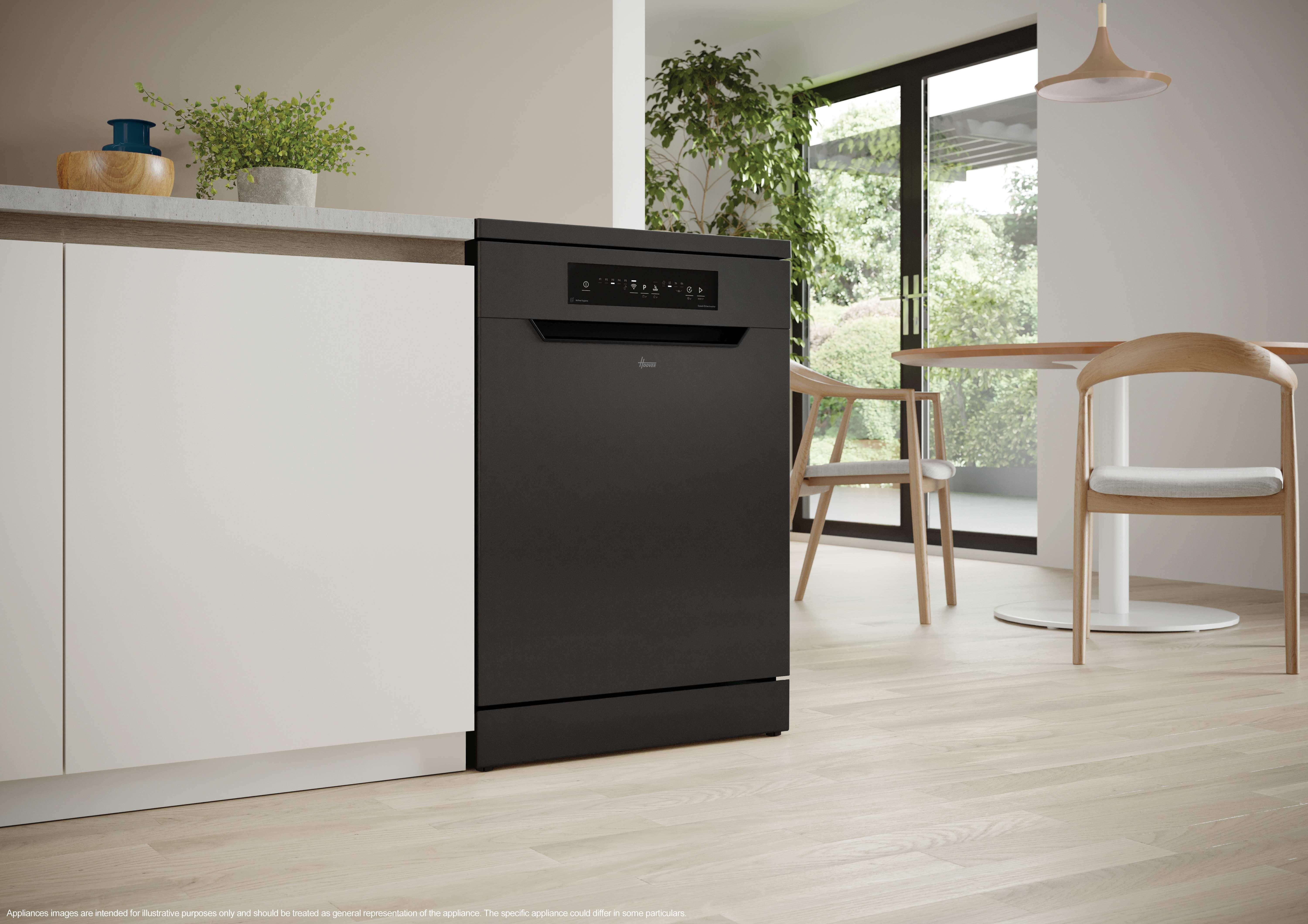 The new H-Dish 300 - Black - 13 Place Settings combines the Eco-Power Inverter Motor for powerful, efficient cleaning with the spacious MAXI TUB for larger items. Manage and customize cycles anytime through the hOn app.