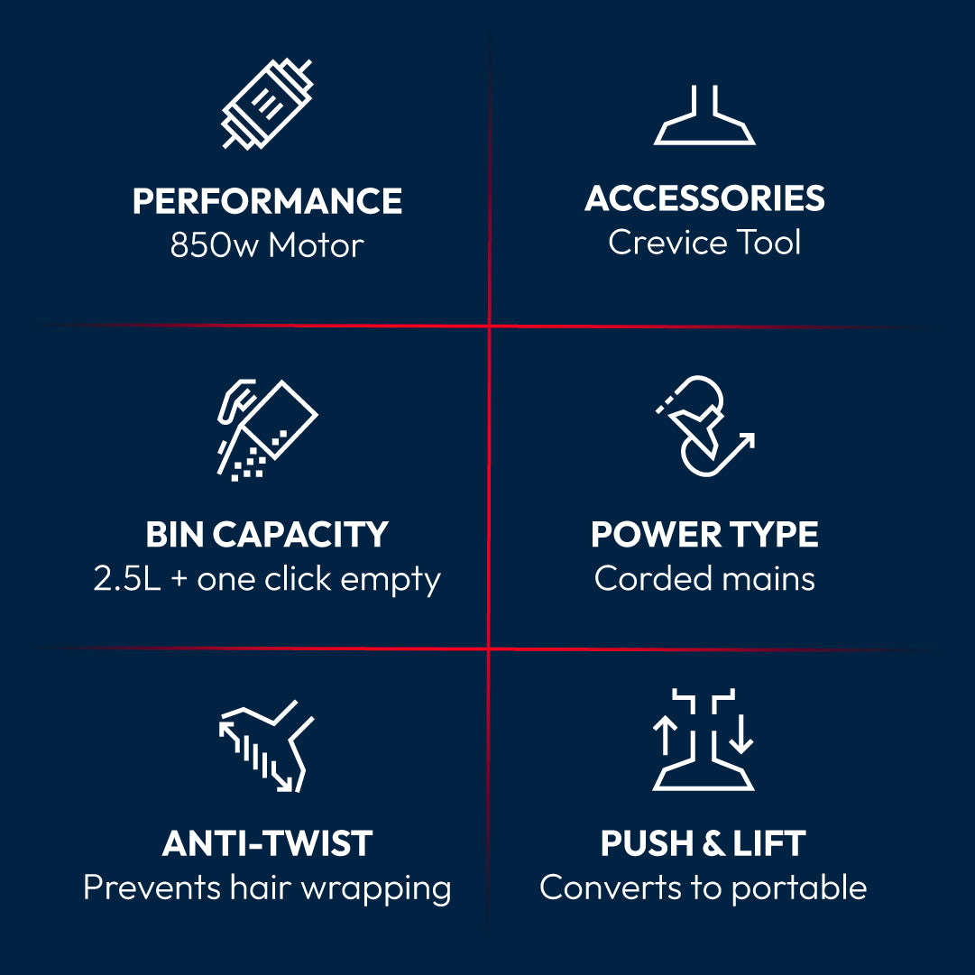 - 850W Powerful All-Floor Performance – No loss of suction* across carpets and hard floors