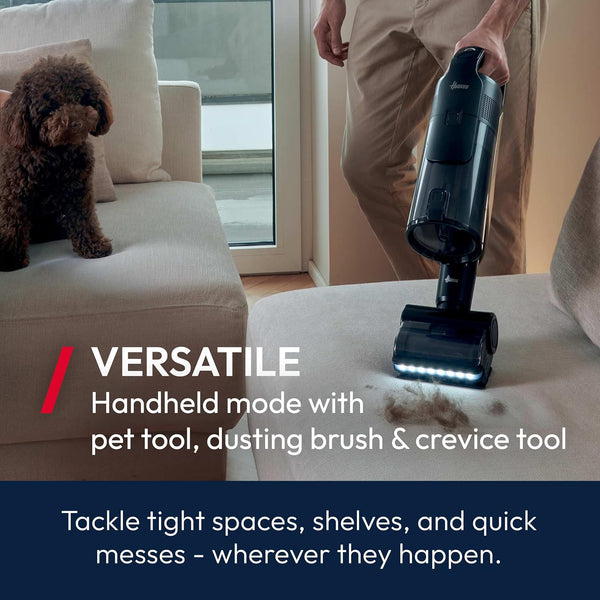 *100 minutes runtime in handheld mode. - Floor Sensing Tech: Auto-adjusts power for carpets or hard floors. LED lights reveal hidden dust.