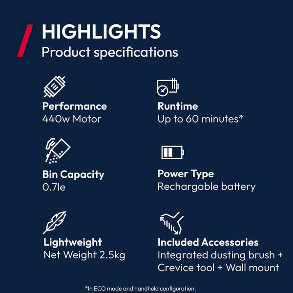 Built with a high-speed motor delivering up to 150AW¹ of suction power for fast, efficient cleaning performance.
