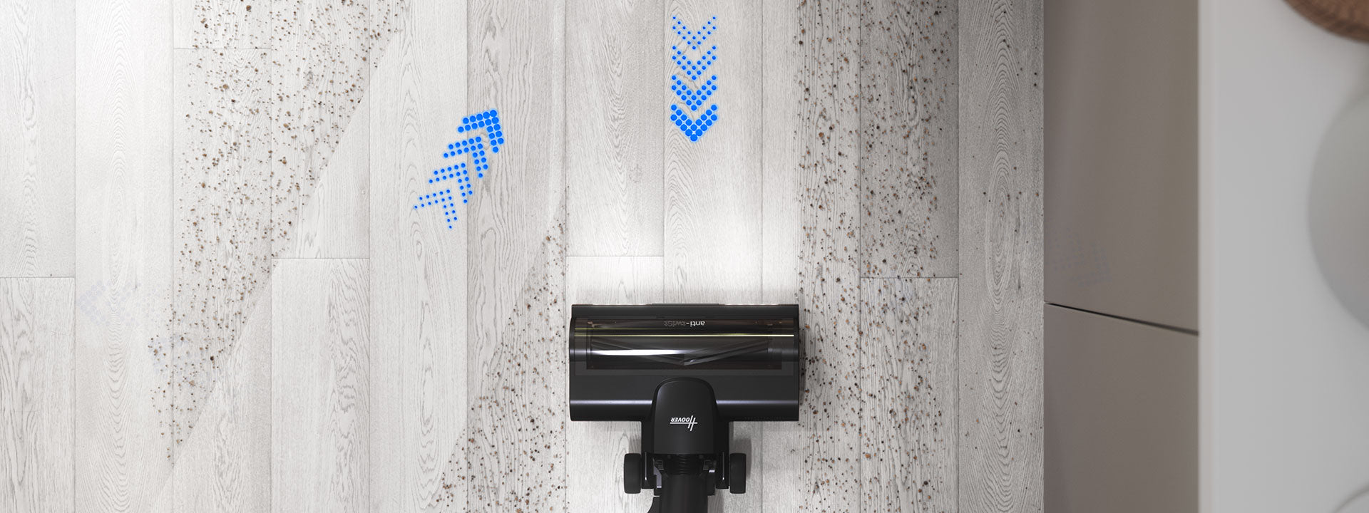 Grâce à la technologie double bord*, la brosse peut ramasser efficacement la poussière des deux côtés pour nettoyer les bords et les plinthes.